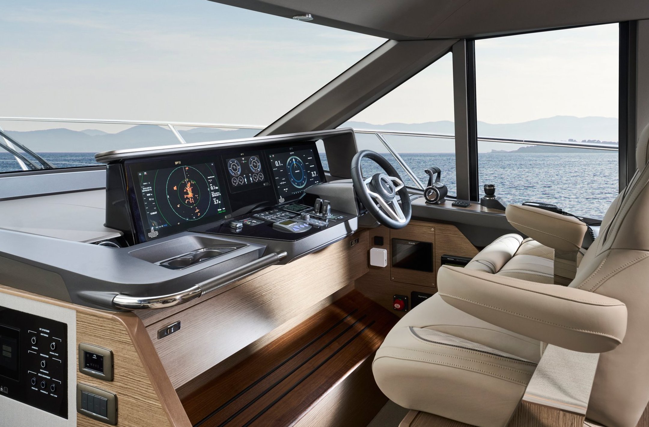 Dual station instrument and controls console at lower helm- 16” colour MFD incorporating GPS/chartplotter, log, echo-sounder- 9” MFD screen displaying engine instrumentation (including fuel levels and fuel flow)- Power-assisted electro-hydraulic steering- Adjustable steering wheel- High-speed magnetic compass- Electronic engine controls- Trim tab controls with indicators- Bow thruster control- Electric anchor winch remote control- Autopilot- Speed and distance log- Echo sounder with alarm- VHF with DSC R/T with intercom- Remote control searchlight- Horn button (to operate twin electric horns)- Audible and visual alarm engine warning system- Audible and visual alarm for bilge pumps- Engine room fire extinguisher warning system- Footrest