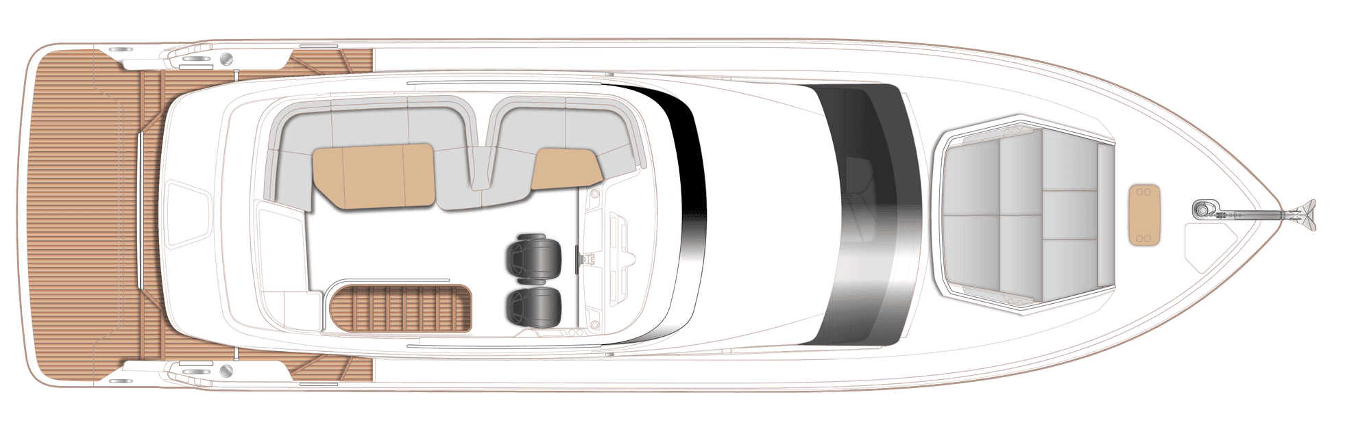 Rivestimento in teak su piattaforma di poppa, scalini di poppa, ponte della cabina di guida, scalinata del flybridge e gradini per il ponte laterale