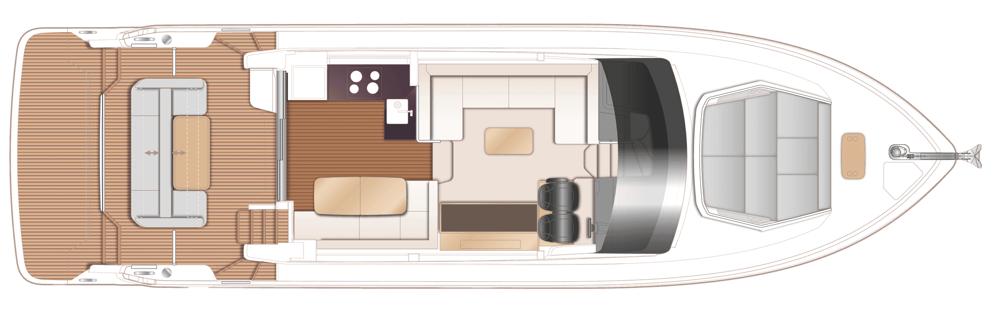 Console di controllo e strumentazione doppie nella plancia di comando inferioreo Display multifunzione a colori da 16" con GPS/chartplotter, registro ed ecoscandaglioo Display multifunzione da 7" con strumentazione del motore (compresi livelli e flusso carburante)o Servosterzo elettroidraulicoo Volante regolabileo Bussola magnetica ad alta velocitào Comandi elettronici del motoreo Comandi flap con indicatorio Comando elica di pruao Telecomando per verricello elettrico dell’ancorao Pilota automaticoo Registro velocità e distanzao Ecoscandaglio con allarmeo VHF con R/T DSC con interfonoo Faro di ricerca con comando a distanzao Pulsante clacson (per usare i doppi clacson elettrici)o Sistema di allarme motori con avviso acustico e visivoo Allarmi acustici e visivi per le pompe di sentinao Sistema di allarme per estintori nella sala macchineo Poggiapiedi