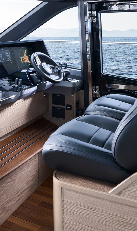 Twin helm seats with fore and aft adjustment for helmsman, crown logo to both seats, flip up base to helm seat for door access