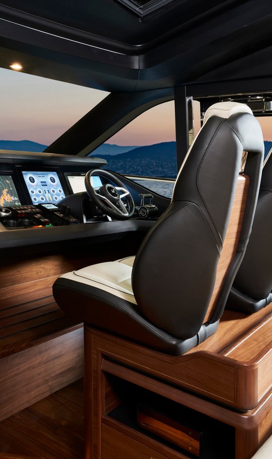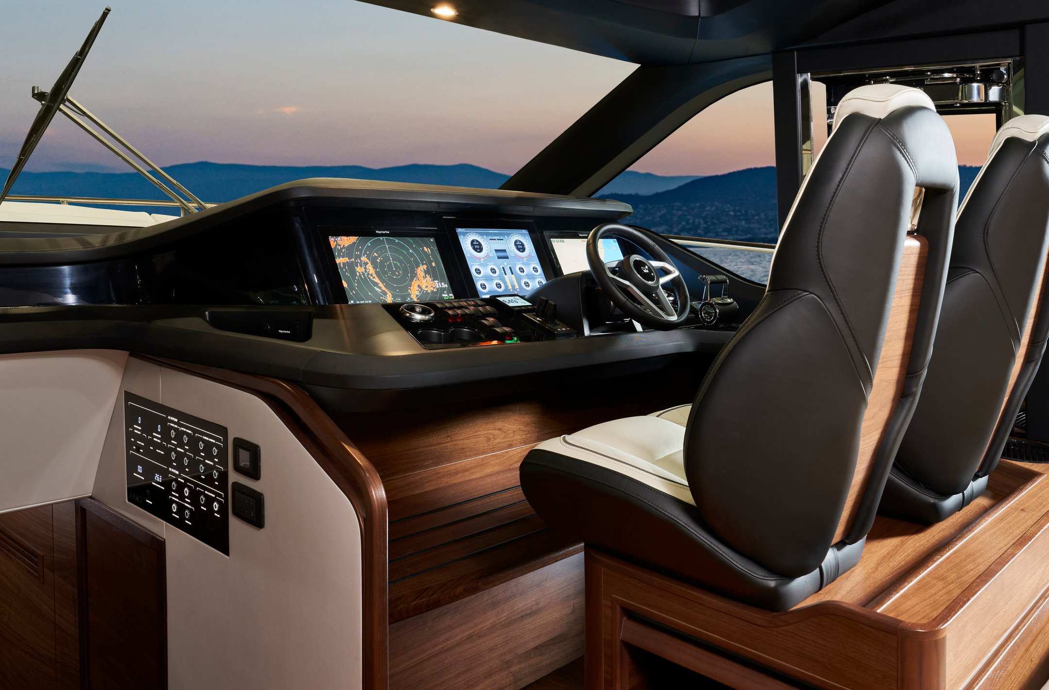 Dual station instruments and controls at Sportbridge and Lower Helm Positions:- Power-assisted electro-hydraulic steering- Adjustable steering wheel- High-speed magnetic compass- Electronic engine controls- Bow thruster control- Electric anchor winch remote control- Colour radar (with scanner) and GPS/chartplotter- Autopilot- Speed and distance log- Echo sounder with alarm- VHF with DSC R/T with intercom- Remote control searchlight- Horn button- Controls for standard trim tabs