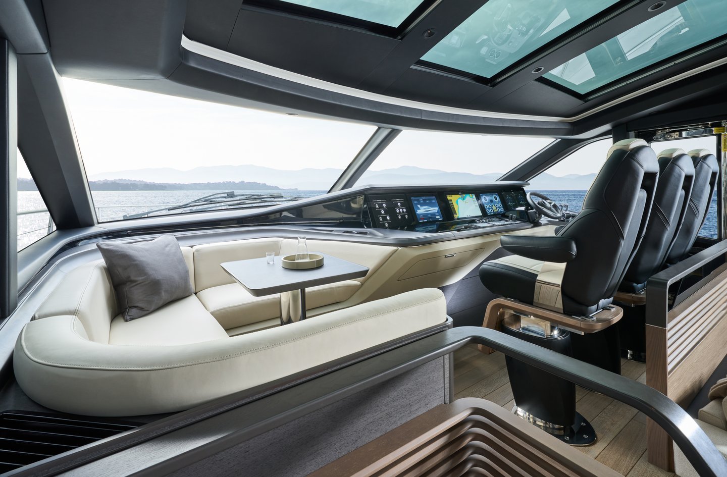 Banquette en U face à la poupe sur l’avant-pont, avec coffre de rangement central (dessus en porcelaine grise) et table basse de série