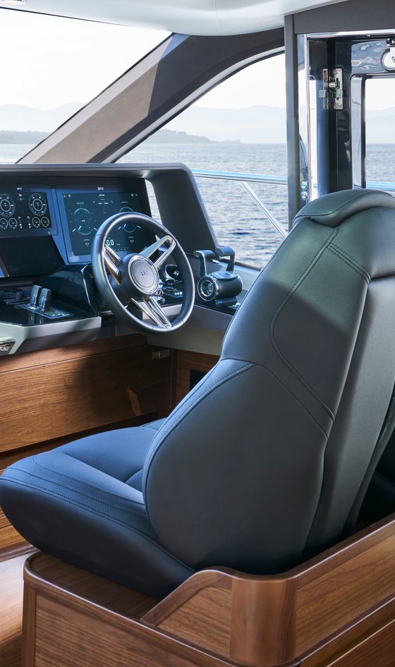 Twin helm seats with manual fore and aft adjustment for helmsman, crown logo to both seats, flip up base to helm seat for door access