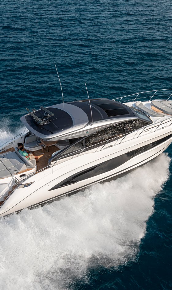 The striking all-new V55 features a sleek and dynamic exterior profile coupled with an intelligent use of space and all the exceptional performance qualities synonymous with our V Class range. Her main deck has been purposely designed for those who enjoy true open-boating. The expansive cockpit features a large L-shaped seating area with additional seating aft around a substantial folding teak table served by a wetbar opposite with electric barbecue. This area connects to the saloon via a drop down sliding door and opening window aft of the galley, seamlessly integrating the two living areas as required. Her main deck also boasts a large sunpad located aft of the cockpit and a further foredeck seating and sunbathing area. With a top speed of 35 knots, she promises to deliver a powerful V Class sports yacht experience.