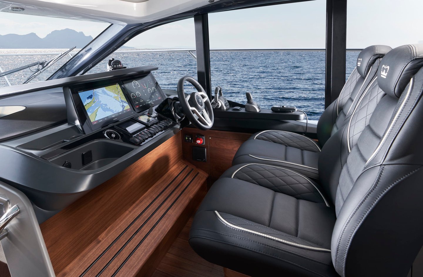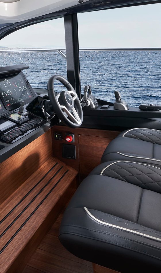 Les instruments et commandes au poste de barre incluent :- Direction assistée électrique - Volant réglable- Compas haute vitesse- Commandes électroniques des moteurs avec contrôle intégré des volets compensateurs- Commande de manœuvre par manette- Guindeau électrique à commande déportée- Écran multifonction Volvo/Garmin de 16”, avec traceur GPS, instrumentation des moteurs, système d’avertissement, commande de pilote automatique, jauges de carburant, loch indicateur de vitesse et de distance, écho-sondeur et indicateur d’angle de gouvernail- VHF R/T avec appel sélectif numérique (DSC) et intercom- Commande distante simple des projecteurs- Bouton de corne de brume pour corne simple