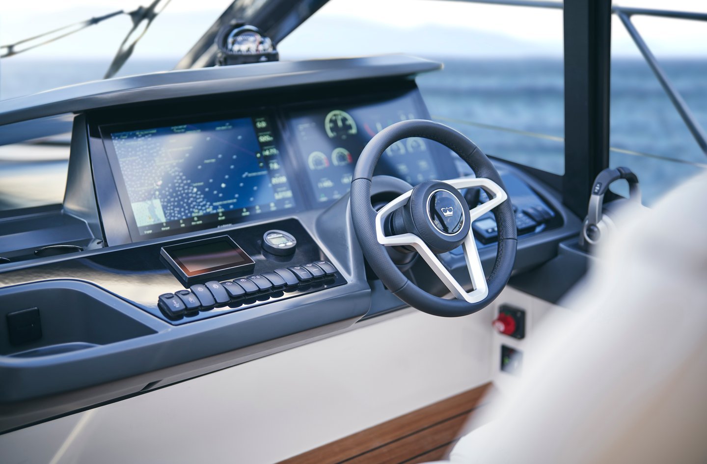 Приборы и органы управления на посту управления:- Рулевое управление с усилителем- Регулируемое рулевое колесо- магнитный компас для быстроходных судов- электронное управление двигателем с интегрированным управлением дифферентом- Джойстик для маневрирования- Электрическая якорная лебедка с дистанционным управлением- 16-дюймовый МФД-дисплей Volvo/Garmin с GPS/картплоттером, приборами контроля параметров двигателя, аварийной сигнализацией, управлением автопилотом, топливомерами, измерителем скорости и расстояния, эхолотом и индикатором положением руля- UKW с DSC R/T с системой внутренней связи- Один прожектор с дистанционным управлением- Кнопка звукового сигнала (для управления одним электрическим звуковым сигналом)