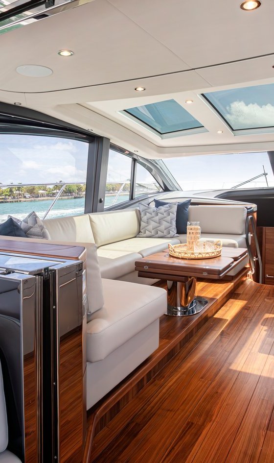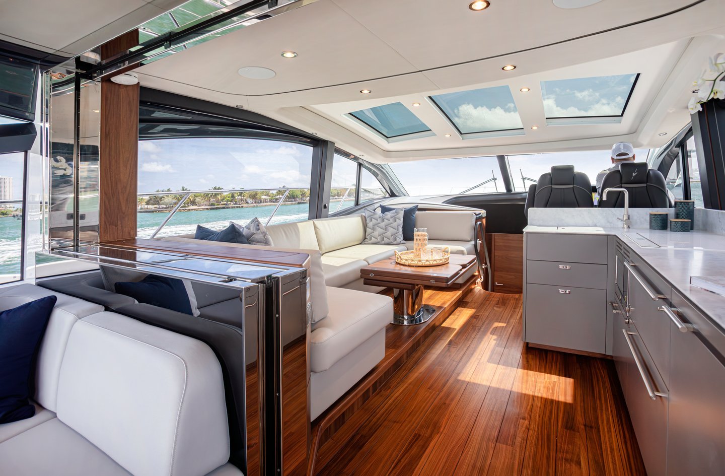 Большая стеклянная дверь с подъемной секцией по правому борту с блокирующей газовой стойкой. Подвижная панель сдвигается к левому борту и убирается, образуя большую открытую секцию.