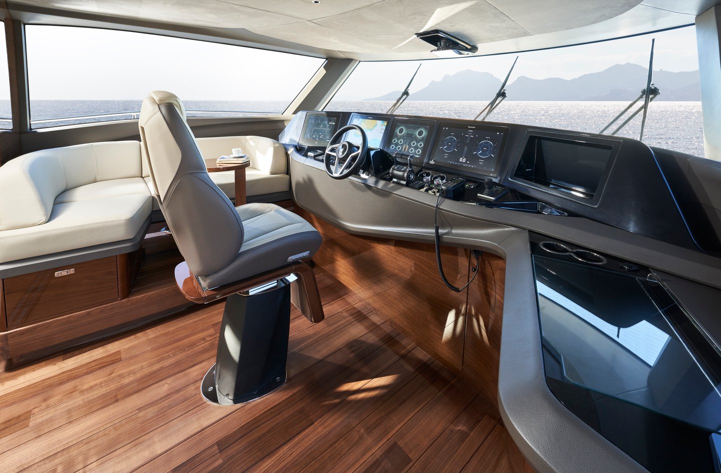 L-shaped companion seating to port (with deployable side table) and optional navigator seat to starboard