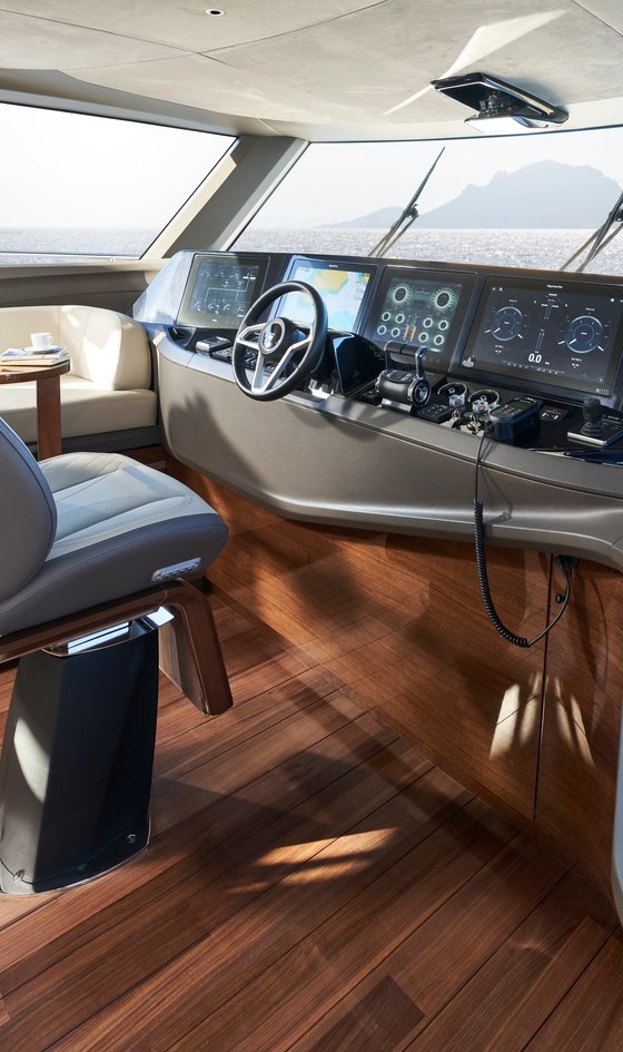Helm position instrument and controls console including:- power-assisted electro-hydraulic steering (SeaStar)- adjustable steering wheel - high-speed magnetic compass- electronic engine controls- bow thruster control- anchor winch remote control- colour radar (with scanner) and GPS/chart plotter (twin 15.6” displays)- Single 15” Böning display- autopilot- speed and distance log- echo sounder with alarm- VHF with DSC R/T with intercom- remote control dual searchlight- horn button (to operate twin electric horns)- audible and visual alarm for bilge pumps- engine room fire extinguisher warning system