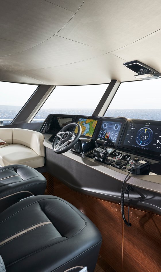 Enclosed pilot house with central leather upholstered electric seat with fore, aft and height adjustment