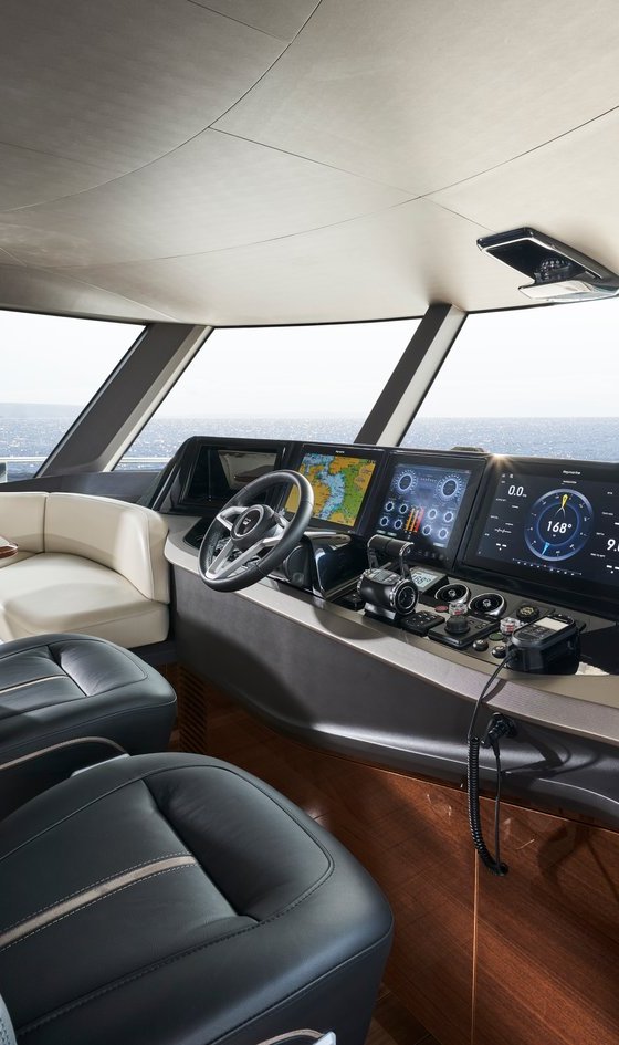 Console de instrumentos e controles de posição do leme inclui:- direção eletro-hidráulica assistida (SeaStar)- volante ajustável- bússola magnética de alta velocidade- controles eletrônicos do motor- controle do propulsor de proa- controle remoto de guincho da âncora hidráulica- radar colorido (com scanner) e GPS/plotter cartográfico (dois monitores de 19")- piloto automático- registro de velocidade e distância- ecobatímetro com alarme- VHF com DSC R/T com interfone- holofote duplo com controle remoto- botão da buzina (para operar as buzinas elétricas duplas)- alarme sonoro e visual para as bombas de esgoto- sistema de aviso do extintor de incêndio da sala de máquinas