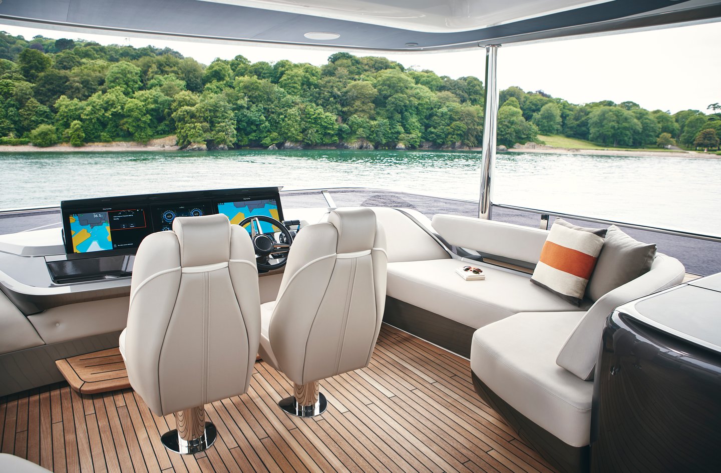 Dual station instruments and controls at Flybridge and Lower Helm Positions:- power-assisted electro-hydraulic steering- adjustable steering wheel- high-speed magnetic compass- electronic engine controls- trim tab controls with indicators- bow thruster control- hydraulic anchor winch remote control- colour radar (with scanner) and GPS/chartploter (twin displays at lower helm)- autopilot- speed and distance log- echo sounder with alarm- VHF with DSC R/T with intercom- remote control searchlight- horn button