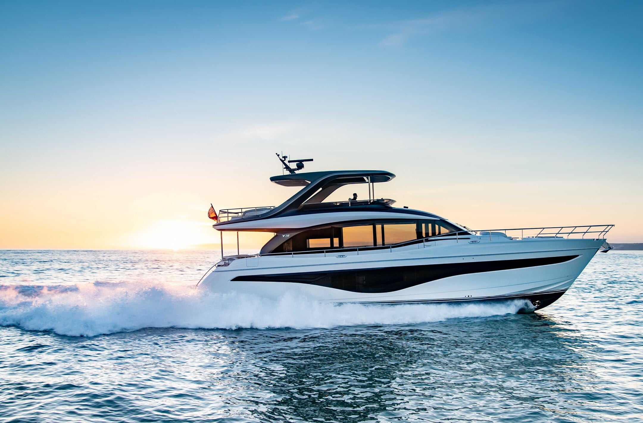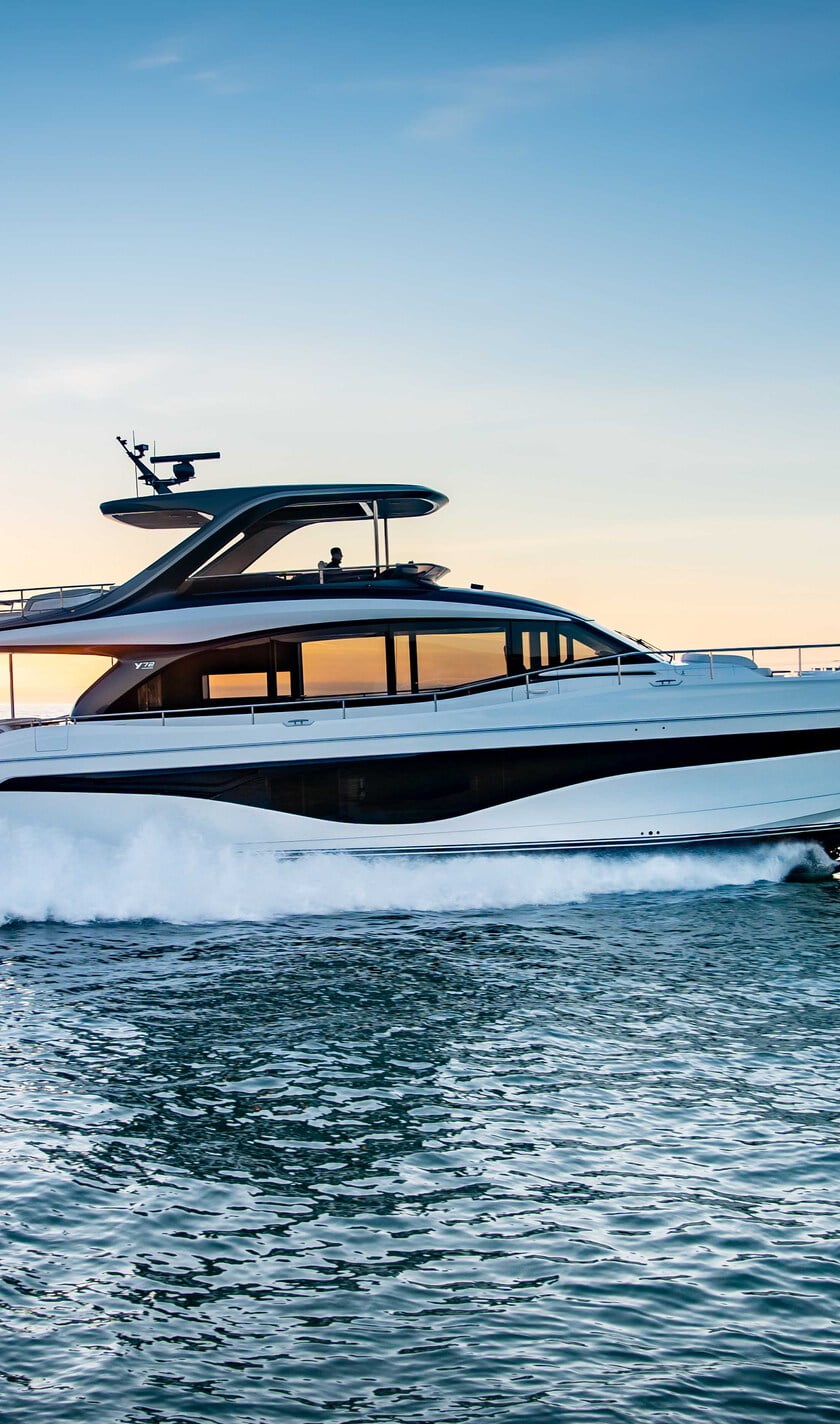 Forward on the lower deck, six guests can enjoy three beautifully appointed guest cabins filled with light from the full-length hull glazing. A dedicated staircase leads from the main deck to the full-beam owner’s stateroom amidships, via a private lobby area connected to the saloon. The sophisticated owner’s stateroom is furnished with a sofa, dressing area and vanity desk wrapped and stitched in Livorno Stone leather for a contemporary finish. Luxurious surroundings exude from the owner’s stateroom with architecturally inspired feature panels, fresh linen wallcoverings and a bronze tint mirror to compliment the scheme. An additional en-suite cabin with two single beds is positioned aft for crew or occasional guests.